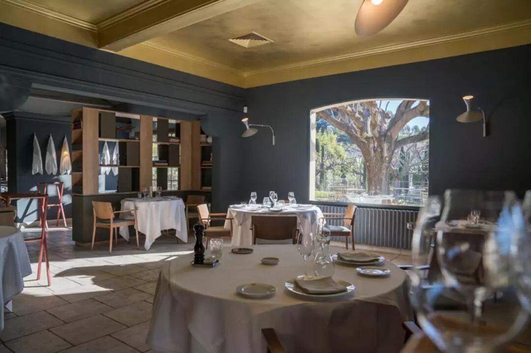 这是一间位于法国Les Baux-de-Provence的五星级酒店BAUMANIÈRE的附属餐厅。酒店环境十分优美,群山环绕,满目翠绿。