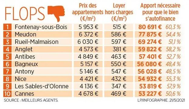 我们以一套20平方米的公寓房出租20年实现盈利为统一标准,并将代理费、公证费、税费以及每月还贷等费用都算在内,以下的10个城市是个人资金投入(apport nécessaire)最少的。