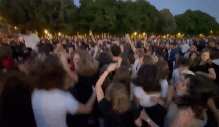 到了周六(6月12日)晚上,同样是在荣军院广场,派对又回来了!依然是近千名年轻人从白天到黑夜的狂欢,依然是警方在晚23点疏散人群,不一样的是,这次有三人被捕。