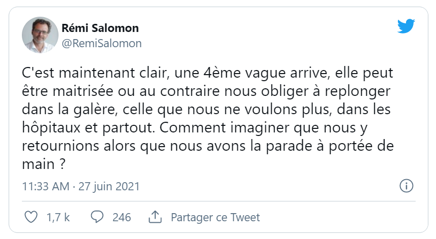 昨天,科学理事会成员Rémi Salomon便在社交网络上说到:很显然,第四波疫情即将到来!