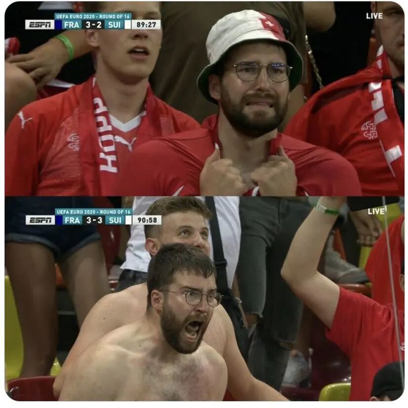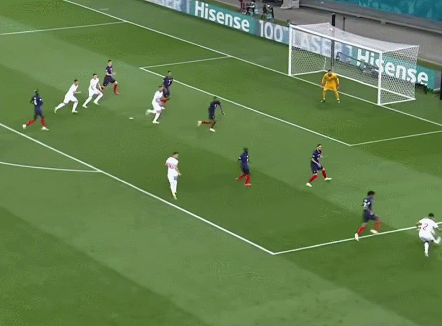 然而,就在所有人都在提前庆祝法国队胜利的时候,瑞士队突然“雄起”!第81分钟,替补登场的Mbabu右路传中,Seferović头球梅开二度,瑞士2-3扳回一城!👇