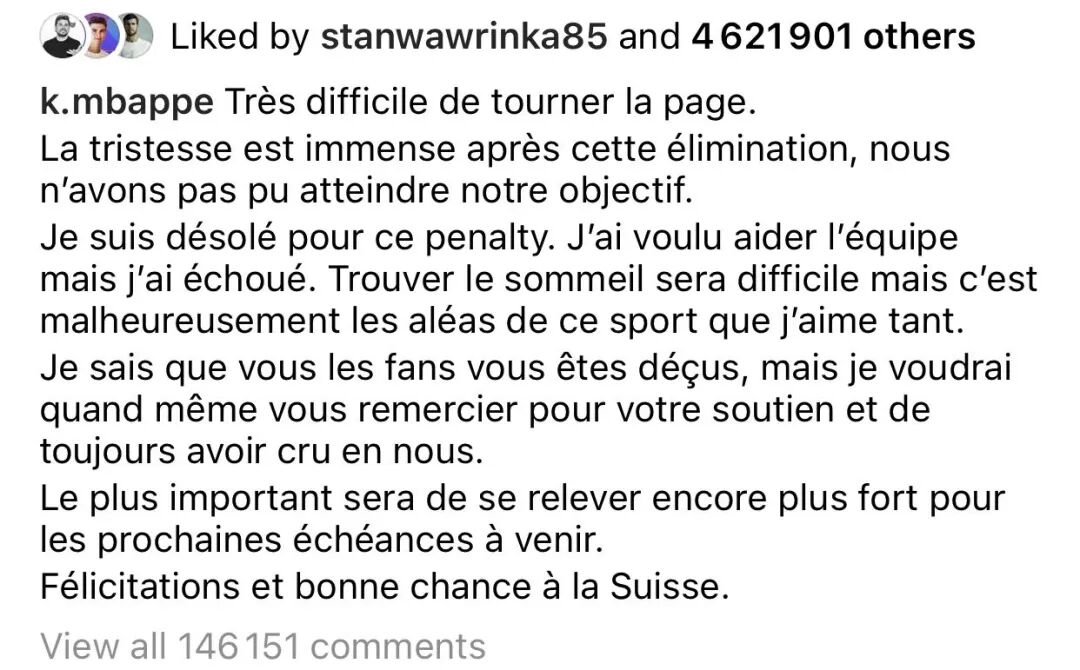 而昨晚,辗转反侧睡不着觉的姆巴佩也在社交网络上发了一篇长文,他表示:很抱歉让大家失望了,我很想帮助球队取得胜利,但是我失败了。