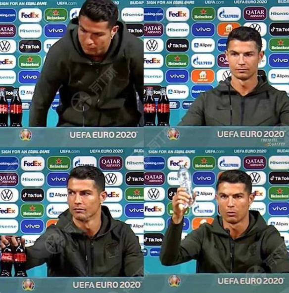 然而在6月14日,葡萄牙小组赛胜利的新闻发布会上,接受采访的C罗当着所有人的面,将摆放在桌面上可口可乐移到了镜头之外,然后拿来了一瓶水,说到:“喝水,别喝可口可乐(Agua,not cocacola)!”