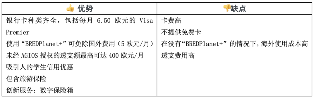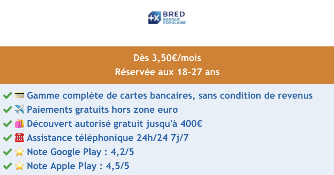 BRED被评选为最适合学生的传统银行第三名。它的青年优惠包括一个账户和一张银行卡,月费3.5欧元起。青年优惠让学生可以通过 “BREDPlanet+”以更低的成本旅行:每月只需5欧元,学生就可以省去国外的银行费用。