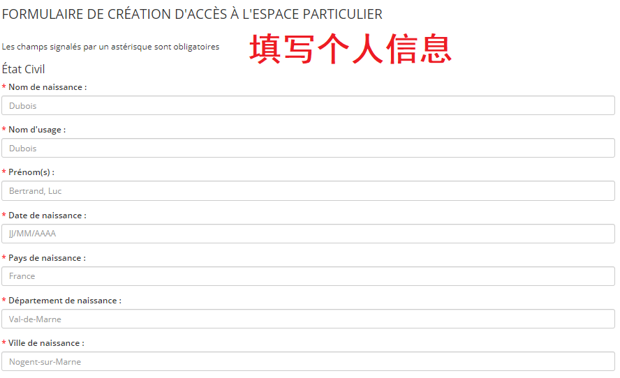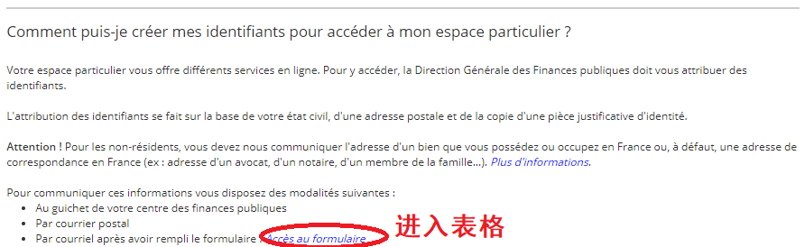 点击最后一行蓝色链接“ Accès au formulaire”,进入个人账户创建表格。点击最下方的“继续(continuer)”键。
