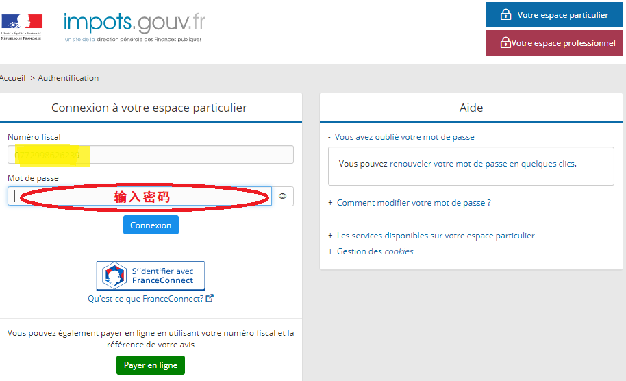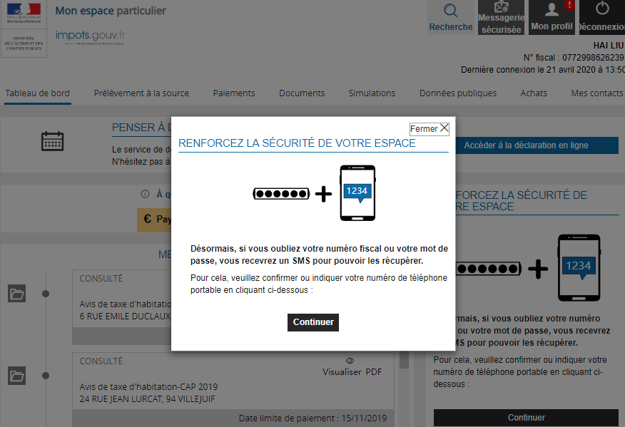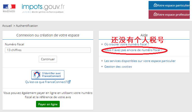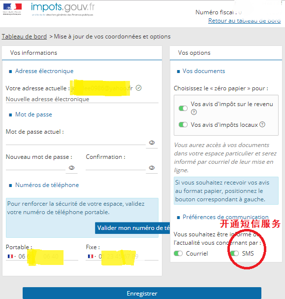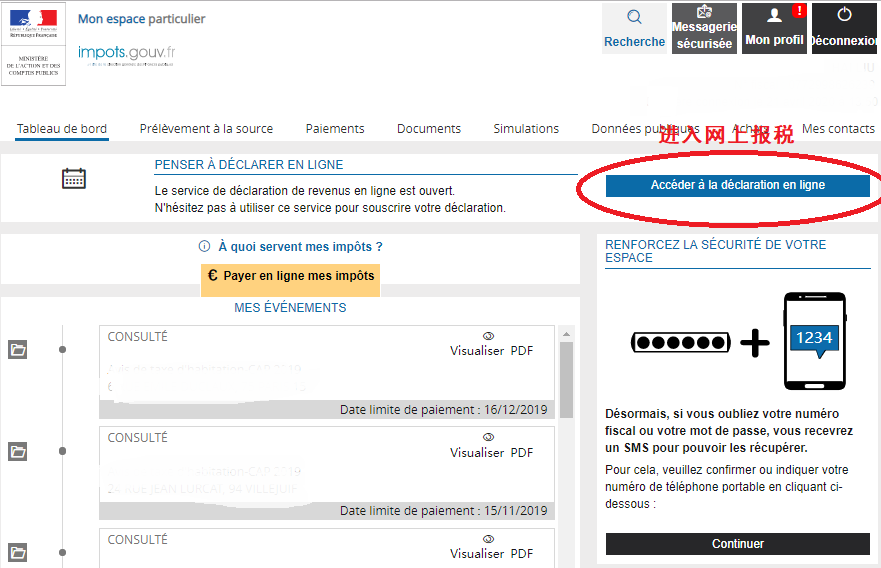 你登录税务局网站的个人账户(espace particulier)时,会收到提示,点击按钮确认手机号码后你会收到验证。以后如果你找不到税号或密码,你可以通过手机短信找回。