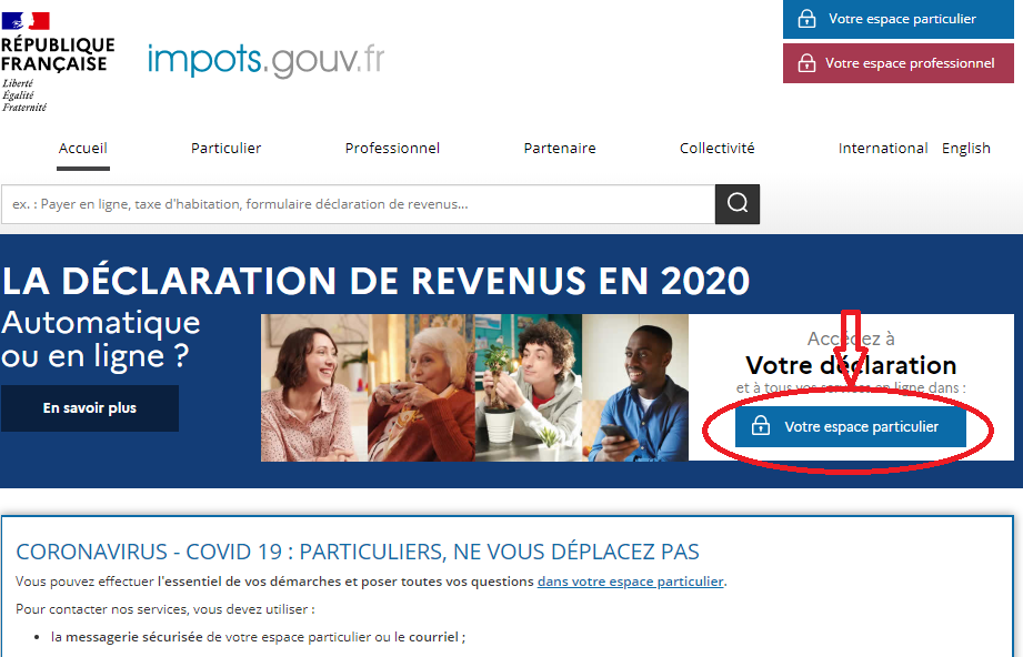 点击置顶的“LA DÉCLARATION DE REVENUS EN 2020”框中的“个人账户(espace particulier)”,然后进入。
