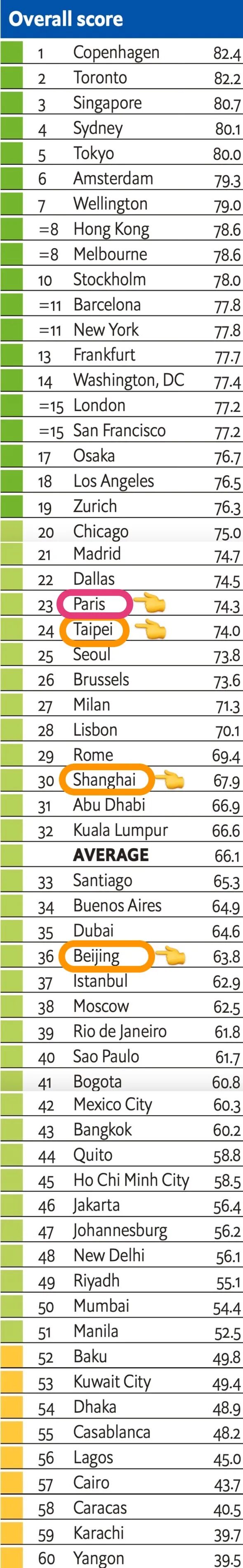在综合榜单中,法国首都巴黎的安全指数排在第23位,紧随其后的是中国台北,位列24。而咱们首都北京的综合得分竟然连平均线都没过,仅有63.8,在60个城市中仅排在第36名。上海排在第30位,得分67.9,仅比平均分高不到两分。