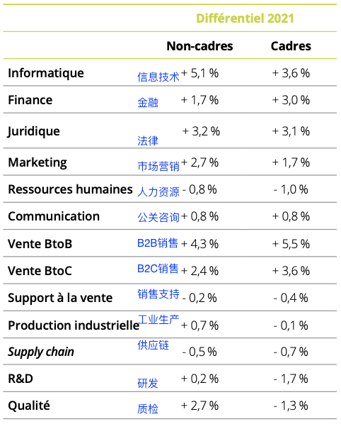 全球最大的会计师事务所德勤(Deloitte)最新发布的《法国个人薪酬报告》显示,2021年法国的工资涨幅非常小,仅有0.6%。尽管这个数字代表整体的水平,具体的增长幅度也因所处行业和职位的不同存在差异,但是与疫情之前相比,这个增长少了不止一点点:作为参考,2019年法国干部(cadre)的工资增长水平为2.8%,非干部人员(OETAM)为2.4%。