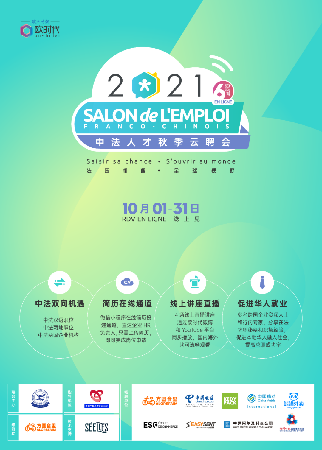 因此,为助力大家进入心中的理想行业,拿到心动的offer,欧洲时报文化传媒公司-欧时代平台联合全法中国学者学生联合会,共同推出【2021中法人才秋季云聘会】!(戳链接了解详情👉好消息!就业市场回暖,第六届中法人才交流会即将开始,令人心动的Offer来啦!)