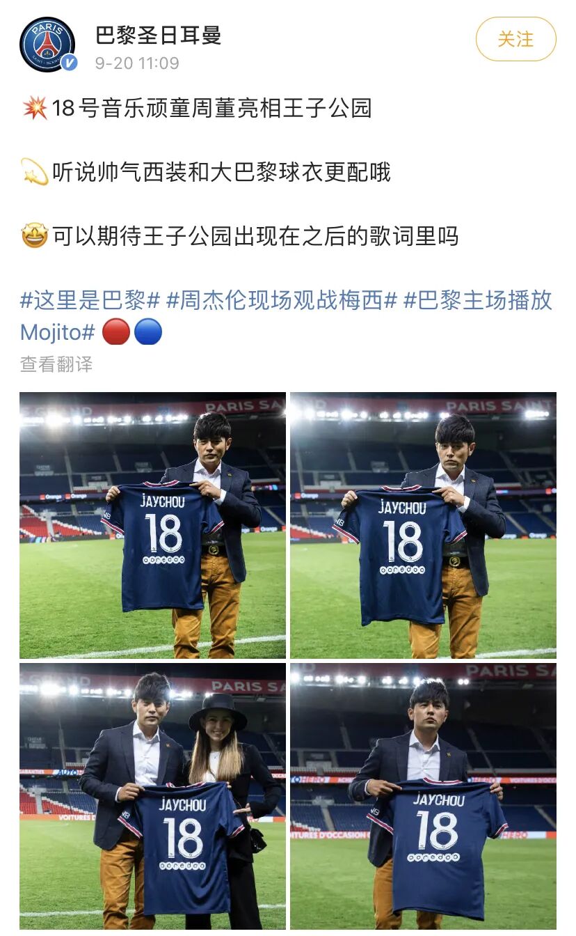 原来咱们的乐坛天王带着妻子去观战了9月20日凌晨结束的法甲比赛。赛后,周杰伦收到了巴黎圣日耳曼俱乐部赠送的纪念礼物👇