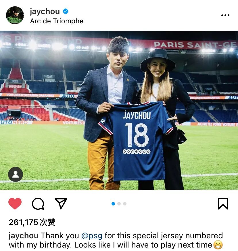大巴黎18号球衣!铁粉们看到这个数字应该就明白了,杰伦的生日正是1月18号。我们的Jay Chou也赶紧在ins上“炫耀”了一番自己收到的特别礼物,并表示了感谢,还打趣道下次再来是不是要上场比赛了。👇(话说,这样看咱们周董好像瘦了不少啊~)