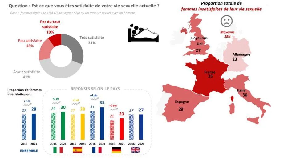 而且,法国女性对性生活的不满足感也在逐年上升。从2016年的31%到2021年的35%,上升了4个百分点。同时,欧洲女性的性活跃程度也有所下降。数据显示,37%的欧洲女性在2021年一个月内都没有性生活(2016年为32%),法国(41%)也比往年上升了10%。