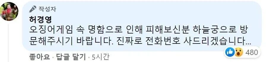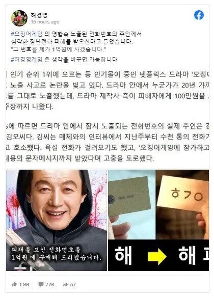 我听说在 #SquidGame 上被泄露电话号码的机主受到了恶意骚扰。对此,我愿意拿出1亿韩元(约54万人民币)买下这个号码。或许,一场 #HuhKyungYoungGame将会上演。