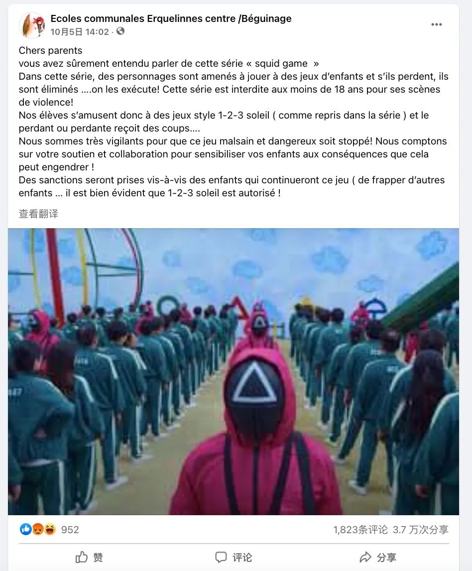 学校校长还在社交网络发布了一篇致信,提醒大家剧中的暴力情节已经出现在了学校操场上。“学生们如今在玩‘一二三木头人’,而输家会被殴打……我们对此非常警惕,认为这种不健康危险的游戏应当停止!” 目前,这份公开信被大量转发,已被分享超过2.1万次。