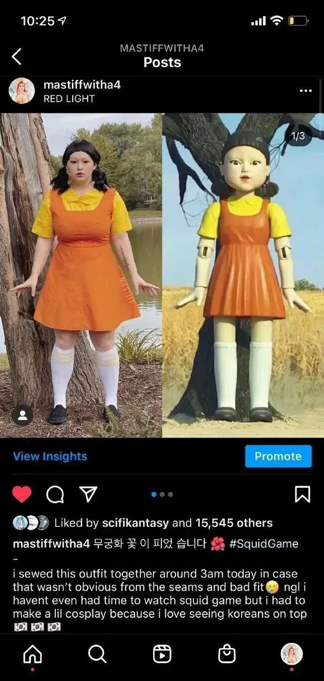 在instagram上,也掀起了一阵“鱿鱼游戏”Cosplay。一位名叫“MSTIFF”的女生连夜手工缝制了《鱿鱼游戏》中女孩人偶的裙子并晒出对比图。