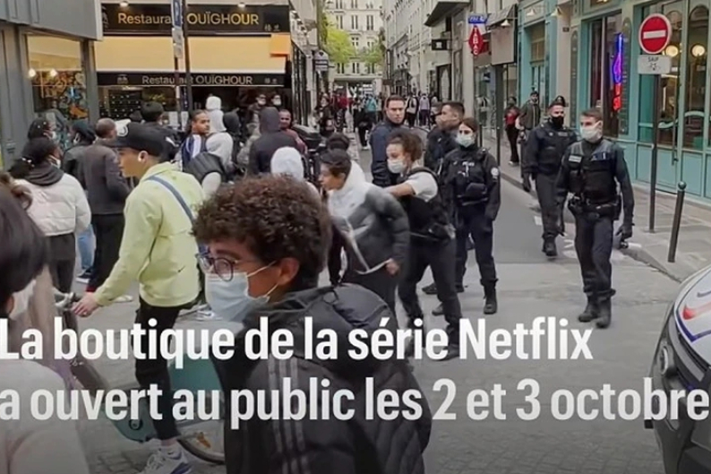 10月2日-3日,法国Netflix在巴黎租下一家咖啡馆并开设了《鱿鱼游戏》主题快闪店。不仅重现了剧中游乐园的场景,也让现场粉丝们体验了一把剧中出现的“椪糖”“一二三木头人”“弹珠”等游戏,还让剧情中的蒙面卫兵在现场维持排队秩序。