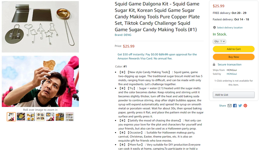 在亚马逊(AMZN.O)、eBay (EBAY.O)和Coupang电商平台里,同款dalgona烹饪套装的价格已经炒到了25.99美元!