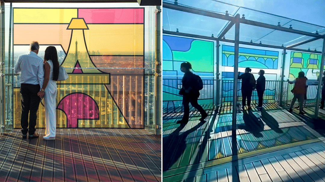 在“色彩大师”COLORAMA的布置下,这个210米高的蒙帕纳斯大厦观景台将焕然一新!一幅长长的壁画贴在透明的屋顶,整个“光之城”变得色彩斑斓:埃菲尔铁塔、凯旋门、圣心大教堂等标志性纪念碑变得更艺术了。另外,这项展览从早晨开放至夜晚,公众可以在黎明与日落时,看到一个格外温暖的巴黎。