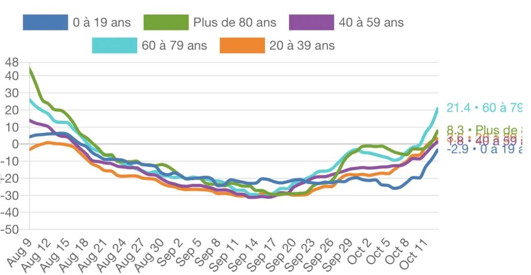 根据10月14日的数据,在全国范围内,发病率从10月7日的每10万居民43例上升到超过48例。发病率的上升很可能预示着新一波疫情的到来:法国设置的发病率警报阀值一直是每10万居民50例。