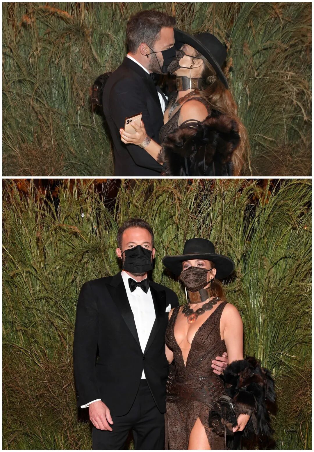 “拉丁女神”JLo和“大本”Ben Affleck的世纪大复合,让多少欧美CP粉直呼“爷青回”!尤其在今年Met Gala上,这对情侣档也是十足吸睛。JLo的一袭修身纱网高叉裙,把好身材突显得淋漓尽致。再搭配一顶牛仔帽,气场全开!站在身旁的“绿叶”Ben Affleck,一身黑色西装礼服也是显得十分绅士。在秀场入口的“口罩吻”,更是给Bennifer的CP粉们狠狠撒了一把狗粮。