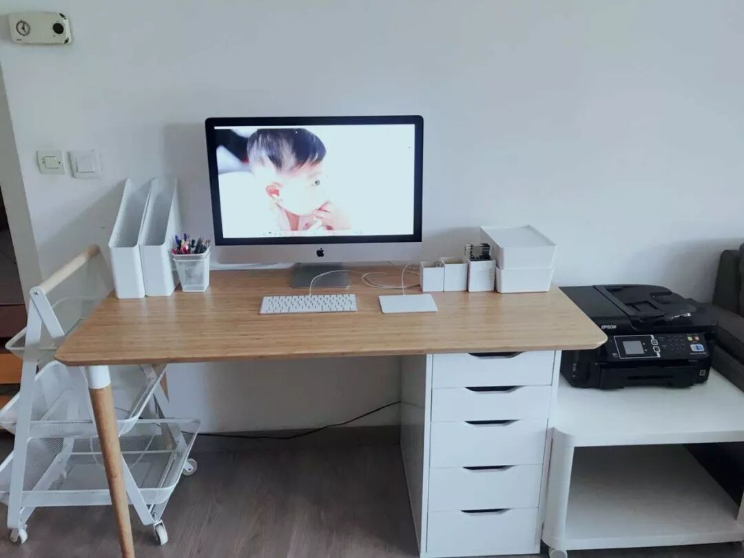 这一套完全可以自己随意组合,选择什么样的桌面或桌腿,什么样的收纳盒等等。左边的小推车也是自己搭配的,觉得比宜家网红款Pakog小推车颜值更高,是Risatorp系列的推车,使用起来也非常方便。右边是Tingby系列的带轮小方桌,推起来很顺手,上面放打印机,下层可以做收纳。