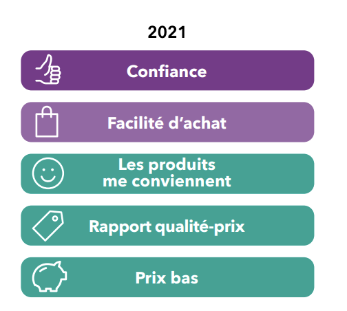 其实,法国人对最爱品牌的选择受到很多因素的影响。调查结果显示,对于消费者来说,对于品牌的“信任度”排在第一位,在此之后才会考虑“购买的便利程度”以及“产品适不适合”的问题。排在第四位和第五位的,分别是品牌的“性价比”以及“价格够不够低”。👇