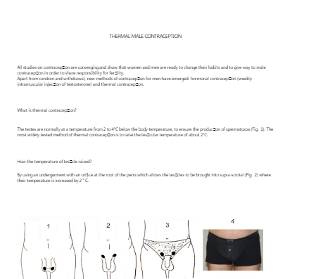 其实自1970年代以来,国际研究就一直在积极推行男性避孕,TMC的原理基于大多数哺乳动物的精子发生的温度依赖性,包括睾丸温度比核心体温低2至5°C的男性。简单点讲就是使用身体作为热源来提高睾丸温度,在实践中,使用特定的内衣使每个睾丸从阴囊升高到靠近腹股沟管外孔的阴茎根部,从而导致睾丸温度升高2°C。