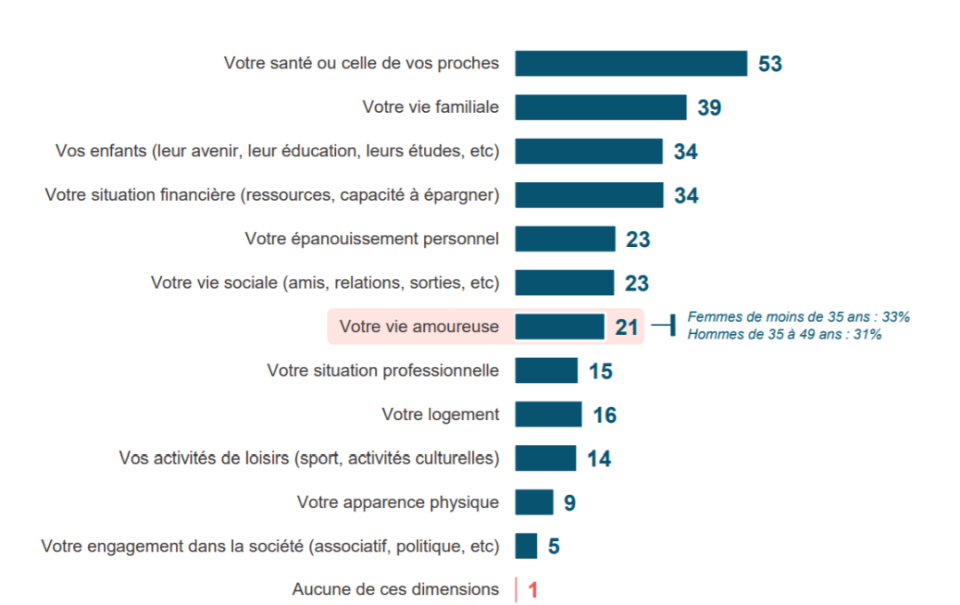 在法国人最关心的问题中,爱情仅排在第七位,位于健康(53%)、家庭生活(34%)和社交生活(23%)等因素之后。