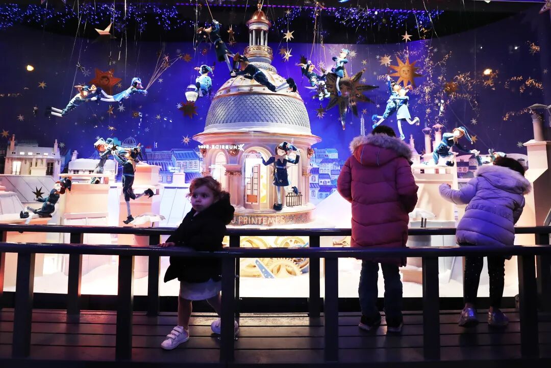 11月21日,孩子们在春天百货商店的圣诞橱窗前驻足欣赏。
