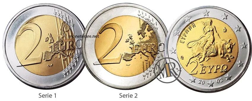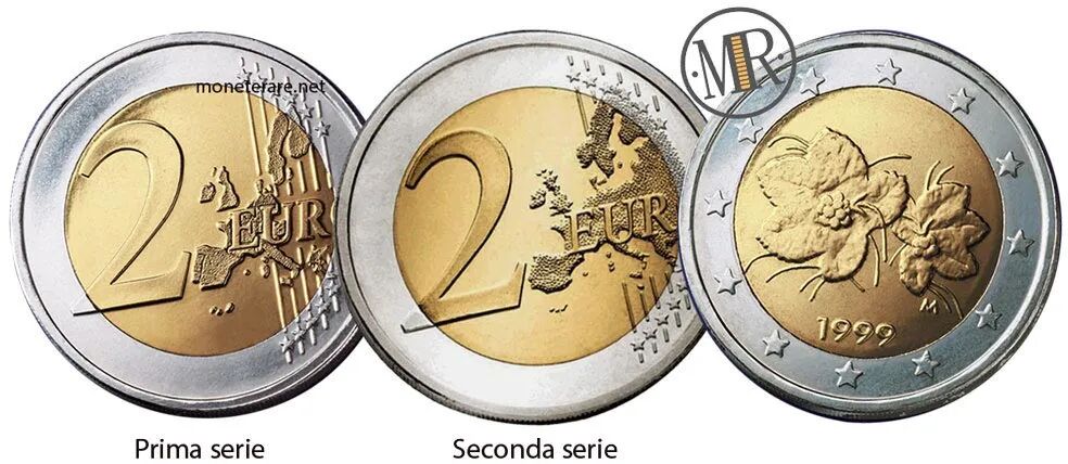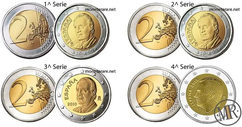 西班牙的2欧元硬币共有四版:第1版背面是胡安卡洛斯一世国王的半身像;第2版只在此基础上做了细微的改动,去除了正面代表国家/地区地图中的边界;第3版调整了铸币厂标记“M”的位置;第4版图案为国王费利佩六世的脸。