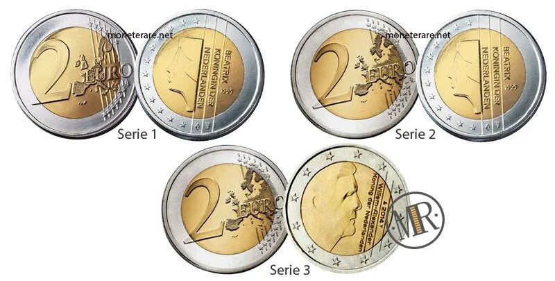 荷兰的2欧元有三版:第1、2版展示了贝娅特丽克丝女王的脸;而第3版硬币描绘了威廉·亚历山大国王的肖像,他在其母亲贝娅特丽克丝于2013年退位后即位。