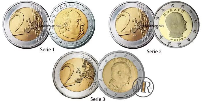 摩纳哥的2硬币有三版:第1版描绘了兰尼埃三世亲王的半身像;第2、3版,图案是阿尔贝二世亲王的半身像。