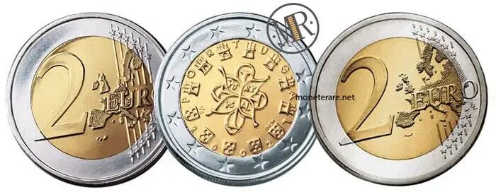 葡萄牙的1欧元与2欧元设计图案相同,硬币上印有1144年葡萄牙国王唐·阿方索·恩里克斯的印章。在外面的圆圈中,有7个城堡,散布着分成音节的PROTUGAL字样,紧挨着它的是5个印章图案