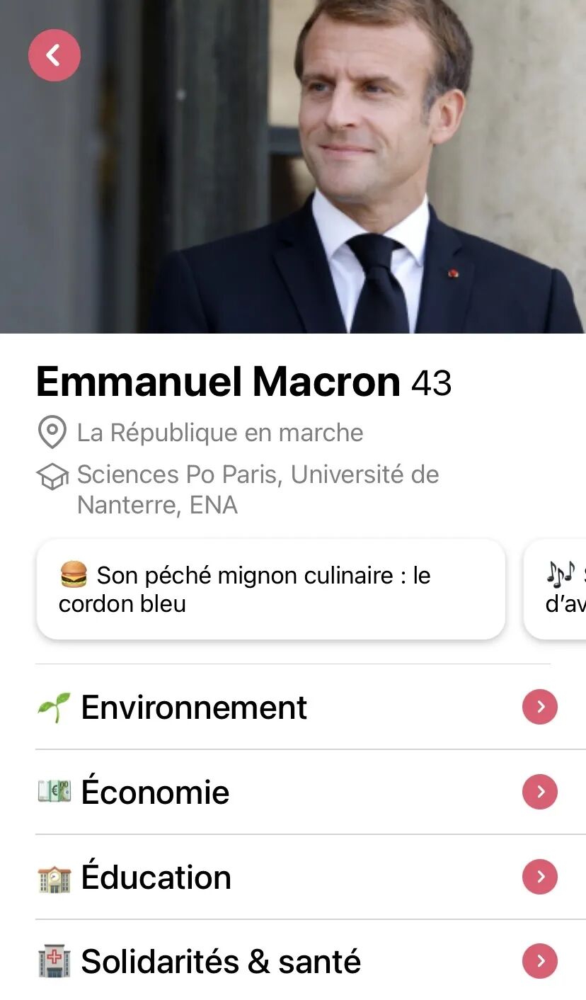通过Tinder寻找约会对象,小编知道这个“操作”对大家来说并不陌生,但是各位有想象过通过一款类似Tinder的软件来寻找和自己“match(匹配)”的2022法国总统候选人吗?
