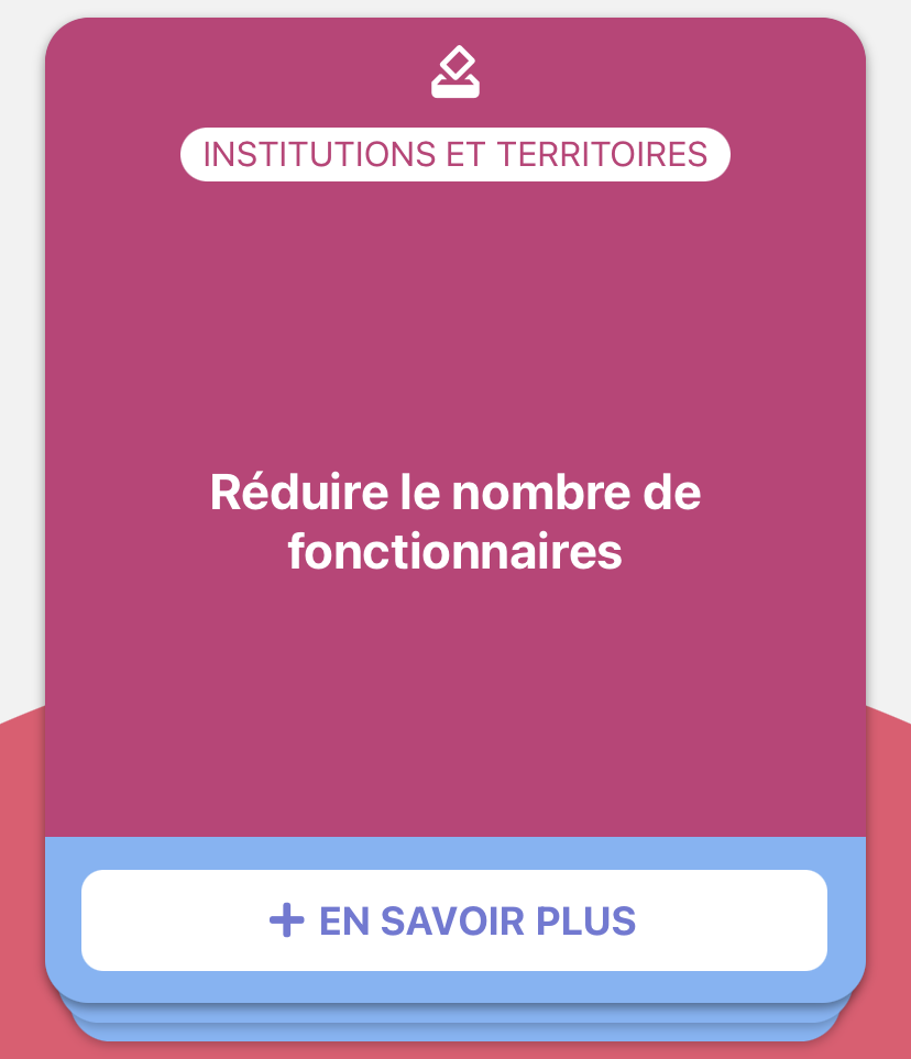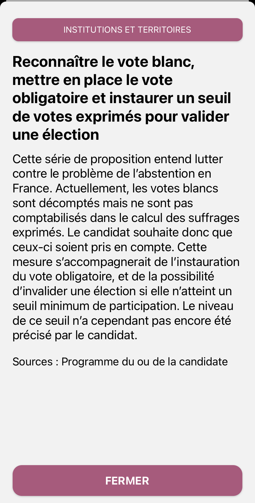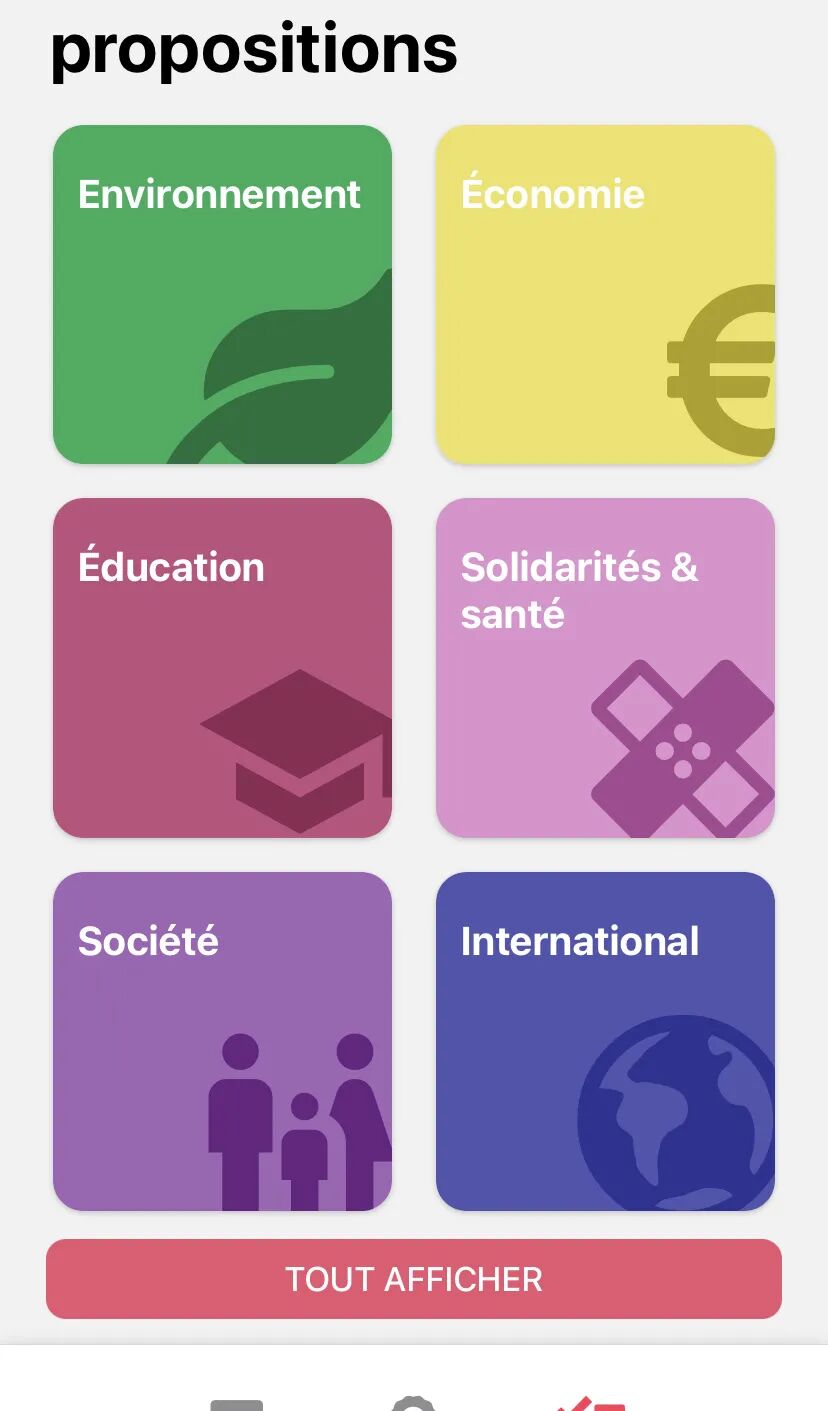 在应用程序中,差不多有500个提案被整合到数据库里,共分为十个主题,从经济到安全,包括环境和国际。联合创始人François表示:我们确保提案数量是平衡的,每个候选人都有同样多的提案,这个应用程序也保持完全中立的立场,对任何一个候选人都不会有偏袒。