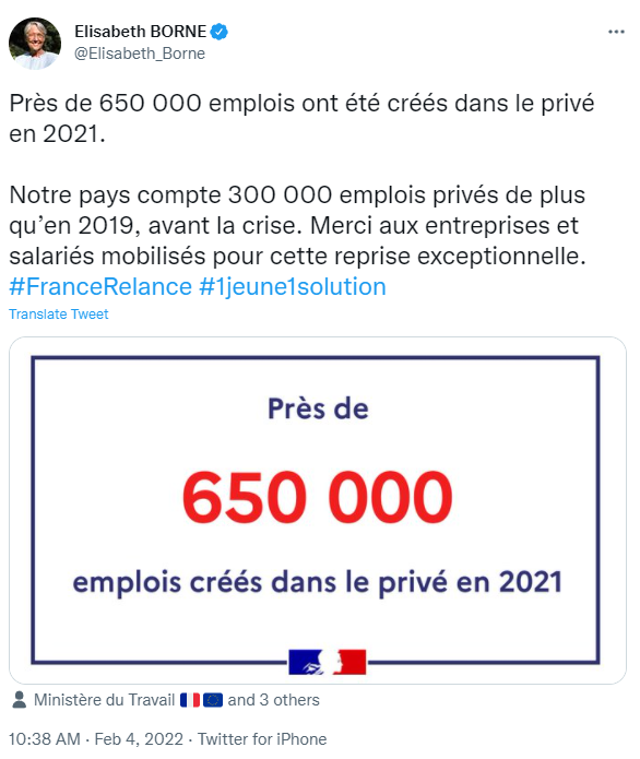 与疫情前的2019年相比,法国私营企业的岗位增加了 30 万个。感谢参与这次特殊复苏的公司和员工。#FranceRelance #1jeune1solution