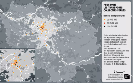巴黎大区居民对于乘坐公共交通工具的不安全感始终很高,40.9%的受访者乘坐公共交通害怕遭遇袭击, 因为巴黎的约1000名安全人员、私人安全公司和 51000 个监控摄像头依然不足以遏制巴黎的公交通勤侵害行为。