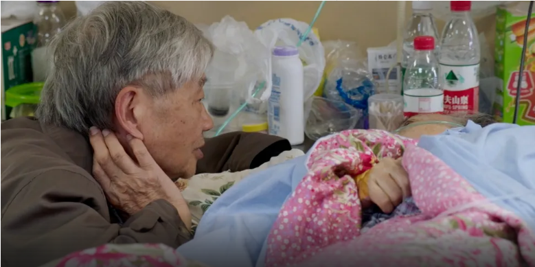 一位老奶奶浑身插满了插管,躺在床上一动不动。病床旁边坐着一位打扮讲究的老爷爷,他是病人的丈夫。每日每夜,老爷爷都坐在床边陪伴妻子,抚摸她的脸庞,与她交谈。隔一段时间,爷爷都要检查一下输液瓶,继续往里面加入药剂。不离不弃的陪伴,是这位白发老人对病床上妻子的浪漫告白。