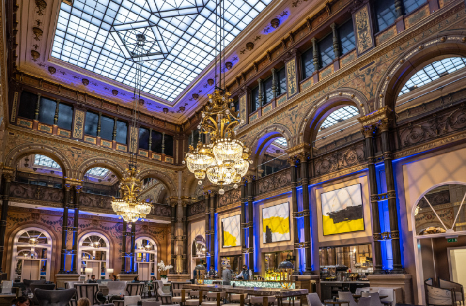 巴黎歌剧院希尔顿酒店就不用多说了吧?历史悠久,遐迩闻名,附近还有热门商圈,在巴黎的小伙伴们一定都知道这个地方。这家酒店是法国为了世博会在1889年打造的,原名Grand Hôtel Terminus,外观被列为历史古迹。大型玻璃屋顶下金碧辉煌,典雅的壁画和华丽水晶吊灯让咖啡馆的高级感扑面而来。