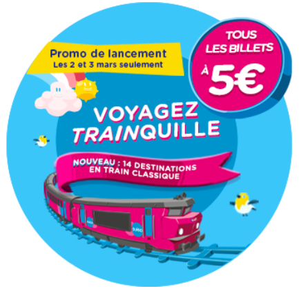 为了庆祝Ouigo Classique的推出,SNCF推出了5欧火车票的特别优惠~在3月2日至3月3日,任何人都能以5欧元的价格购买4月11日至6月19日期间出发的,Ouigo Train Classique项目内任意旅程的火车票!