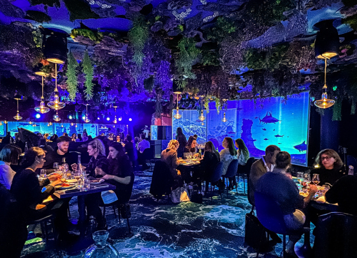 从桌子到动画地板,再到天花板上的植物和珊瑚,我们仿佛置身于海底两万里。到处放置的电子屏幕使用餐过程中出现不同的场景变化。