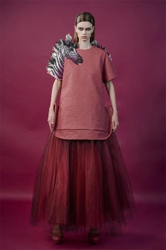 郭培(Guo Pei)这次汲取非洲大草原的灵感,保留生命原始风貌,采用pinax面料,利用解构性的大胆剪裁,呈现现代主义建筑的建明线条和空间结构。