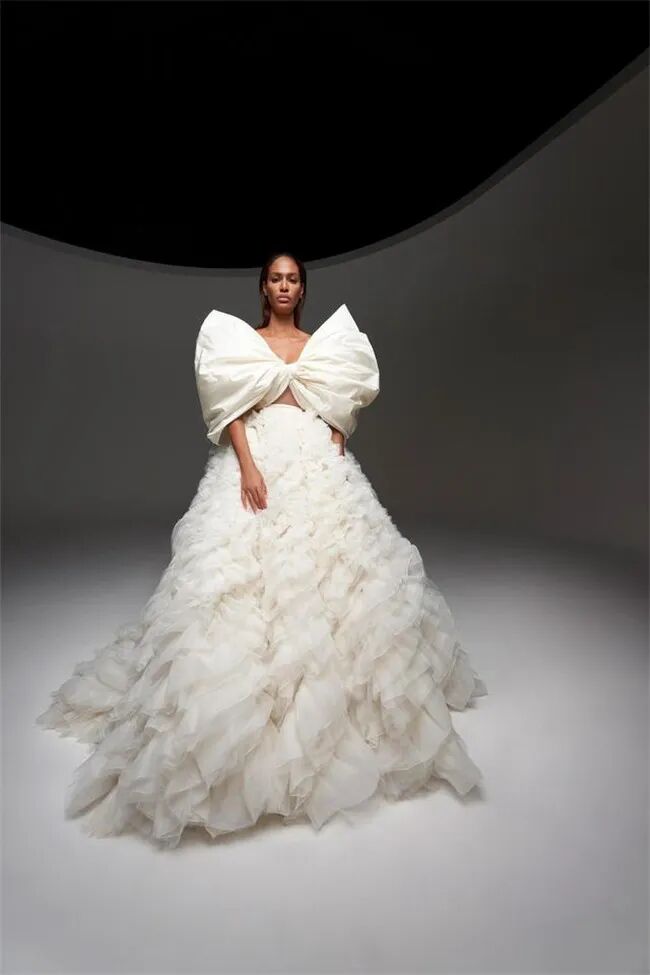 Giambattista Valli 设计师聚焦疫情压抑下绽放的美,用丝绸薄纱、罗缎以及塔夫绸蝴蝶结,以及利落并充满层次感的褶皱来彰显唯美和浪漫。而遮脸面纱的设计,则是对当下疫情的回应,表达人们想要从隔离中回归自然的强烈欲望。