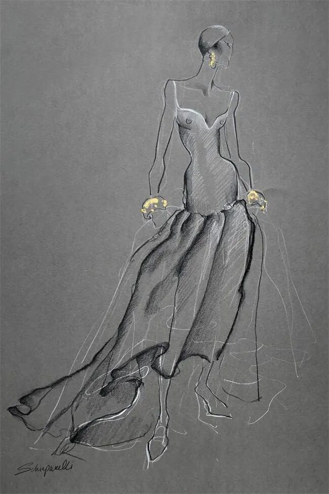 Schiaparelli这次直接公布的是设计稿。用错视感的单品、揉入鲜艳色彩的精致刺绣和雕塑感裙装等元素,续写这个传奇时尚老牌一贯为人称道的超现实主义风格。