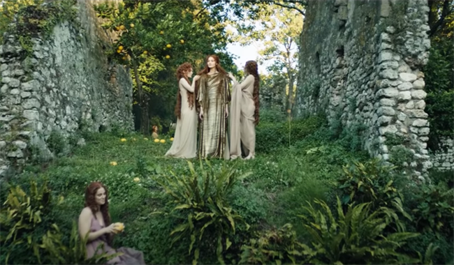 影片中仙女身着的是一条由暗金色闪光布料制成的长裙,滑落的褶皱和宽大的披肩与希腊女神的神圣形象颇为契合。