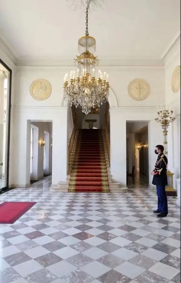 在现场,爱丽舍宫和工作人员严阵以待:地上铺设着60米的红地毯,在台阶上共和国卫队排着整齐的队伍,装饰庄严而隆重......而这正是总统府约800名员工的工作呈现出来的完美效果。
