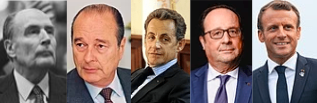 五位法国总统,从左至右依次为:密特朗、希拉克、