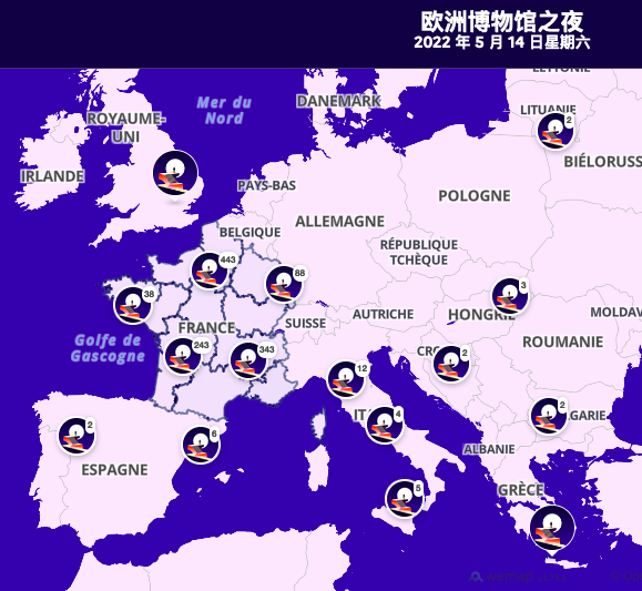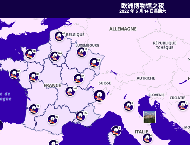👇然后再放大一点,看看法国的情况,就会发现:参与的博物馆主要集中在法国,而在巴黎就有200多家,这将是所有艺术和文化爱好者的一场盛宴!