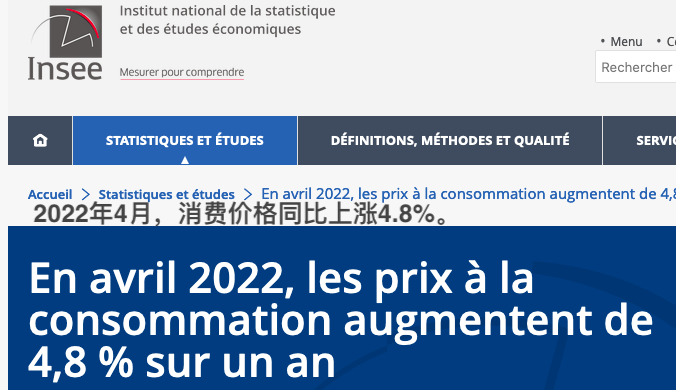 2022年4月消费价格同比上涨4.8%,是Insee的数据库中自1985年11月以来的最高水平。